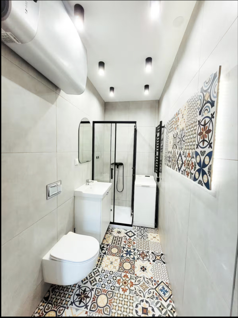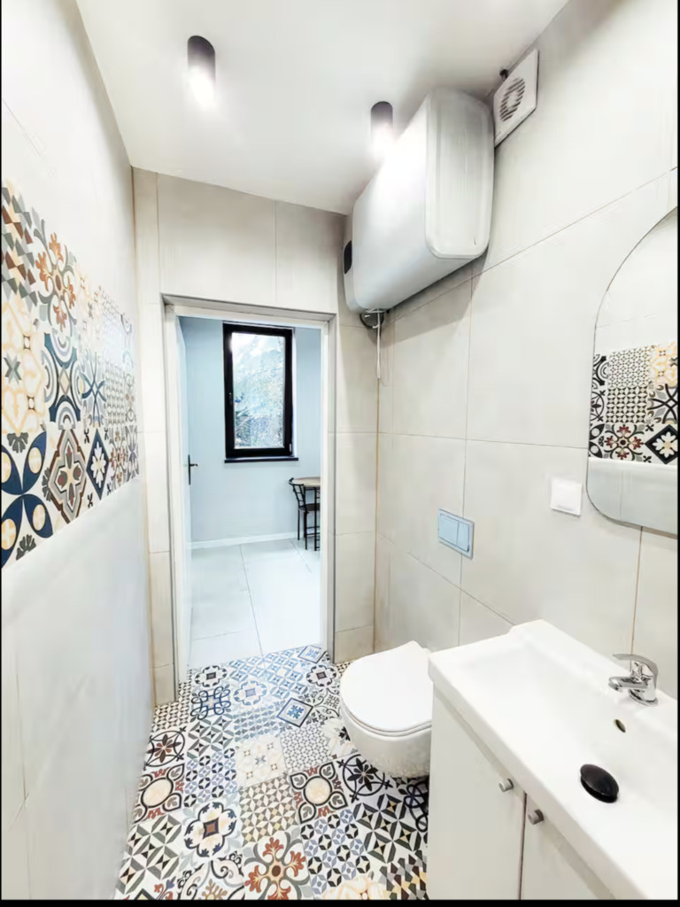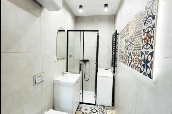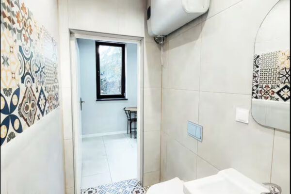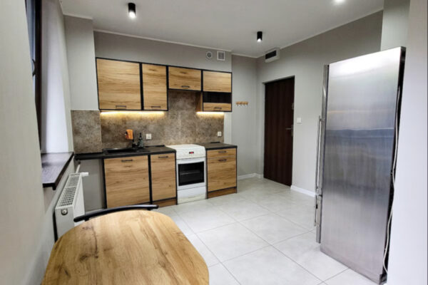 Mieszkanie składa się z przestronnego pokoju dziennego, dużej i widnej kuchni oraz łazienki z WC. Lokal jest po generalnym remoncie, gotowy do wprowadzenia bez dodatkowych nakładów. Okna wychodzą na zachód i północ, dzięki czemu wnętrze jest jasne, ale nie przegrzewa się latem.