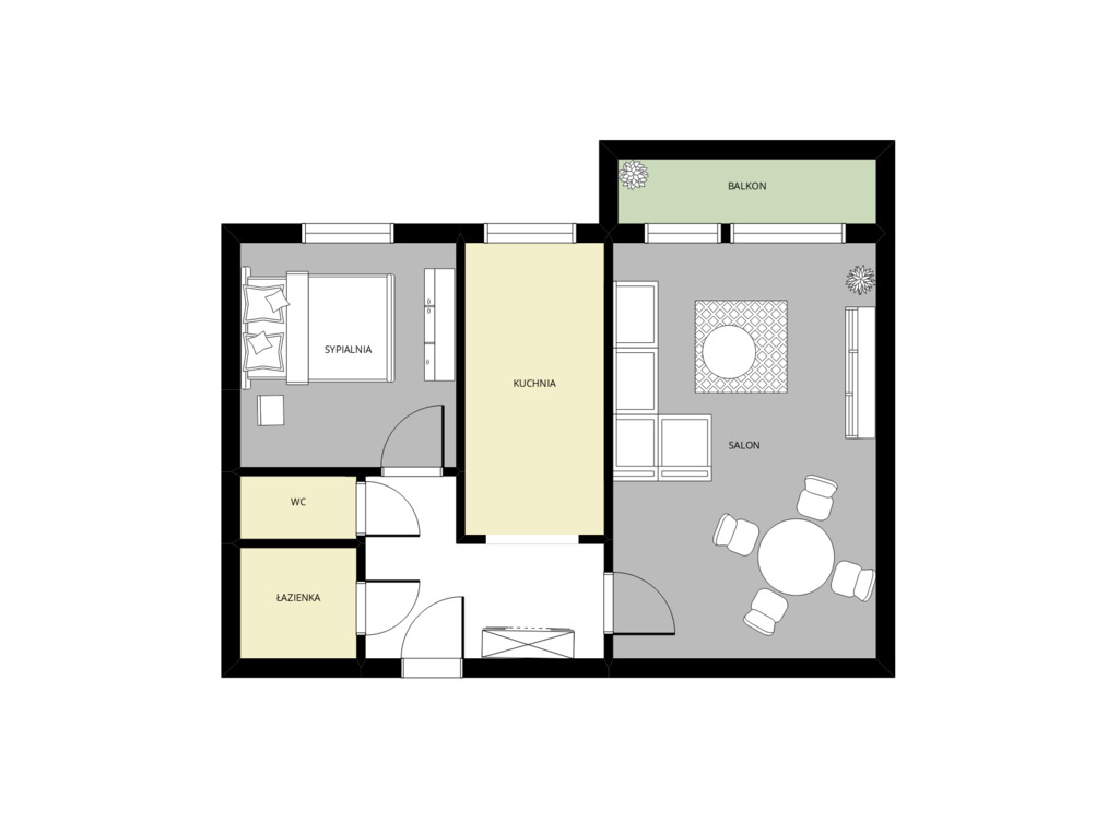 Centralnym punktem mieszkania jest duży salon ( z wyjściem na balkon), który z powodzeniem spełnia funkcję miejsca do wypoczynku i spożywania posiłków. Dobrze zorganizowana kuchnia sprawi, że pomieścisz w niej wszystkie najważniejsze elementy. Drugi pokój zaaranżujesz dokładnie tak, jak sobie życzysz urządzając np. sypialnie. Łazienka posiadająca odpowiednią przestrzeń została wyposażona w wannę. Dodatkowym atutem jest osobne WC.
