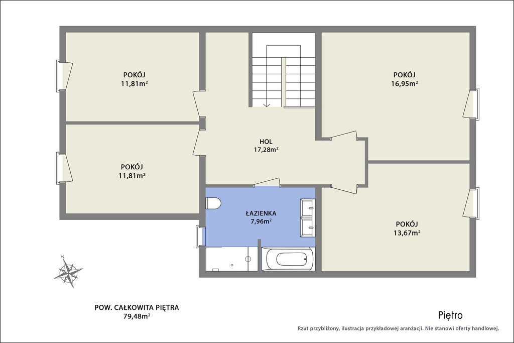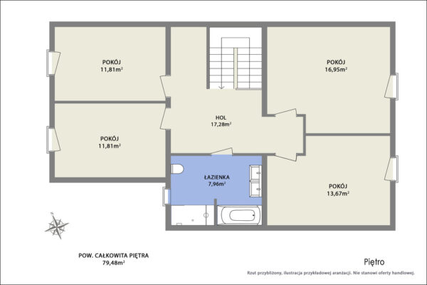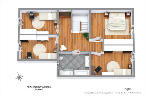 Na piętro prowadzą nas komfortowe schody. Powierzchnia została funkcjonalnie podzielna na 4 pokoje. Sypialnia główna z komfortowym metrażem. Kolejne 3 pokoje idealnie sprawdzą się jako np. pokoje dziecięce. Wygodna łazienka, pozwoli Ci na realizację własnego projektu.
