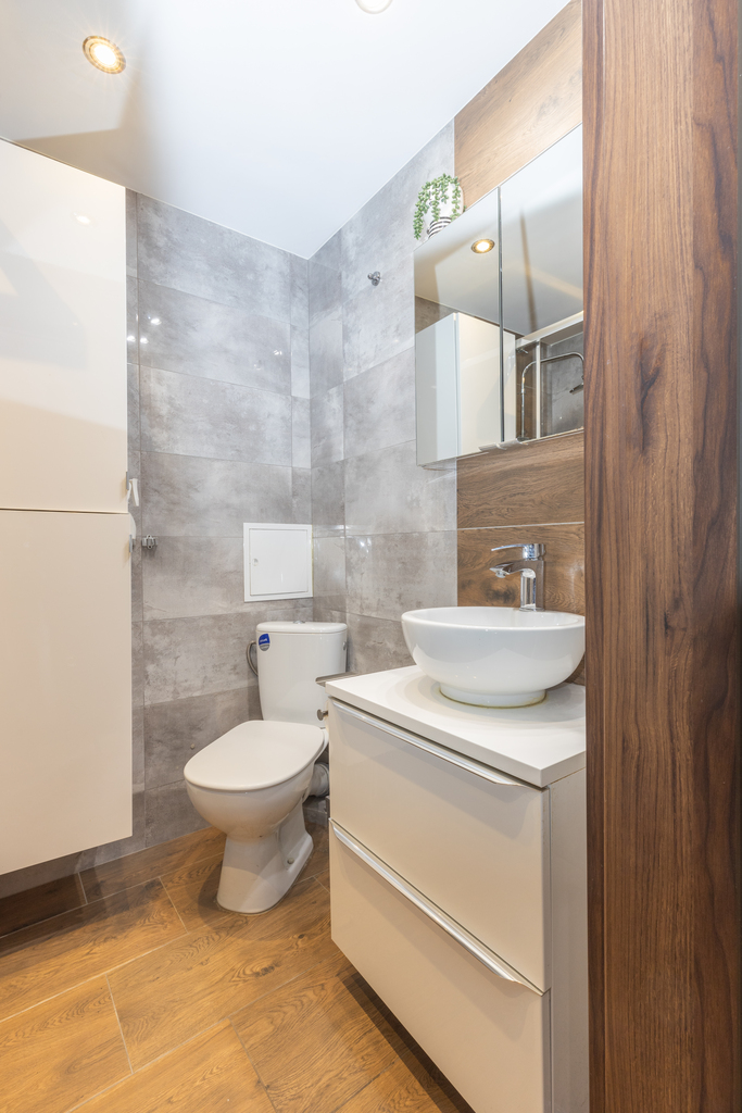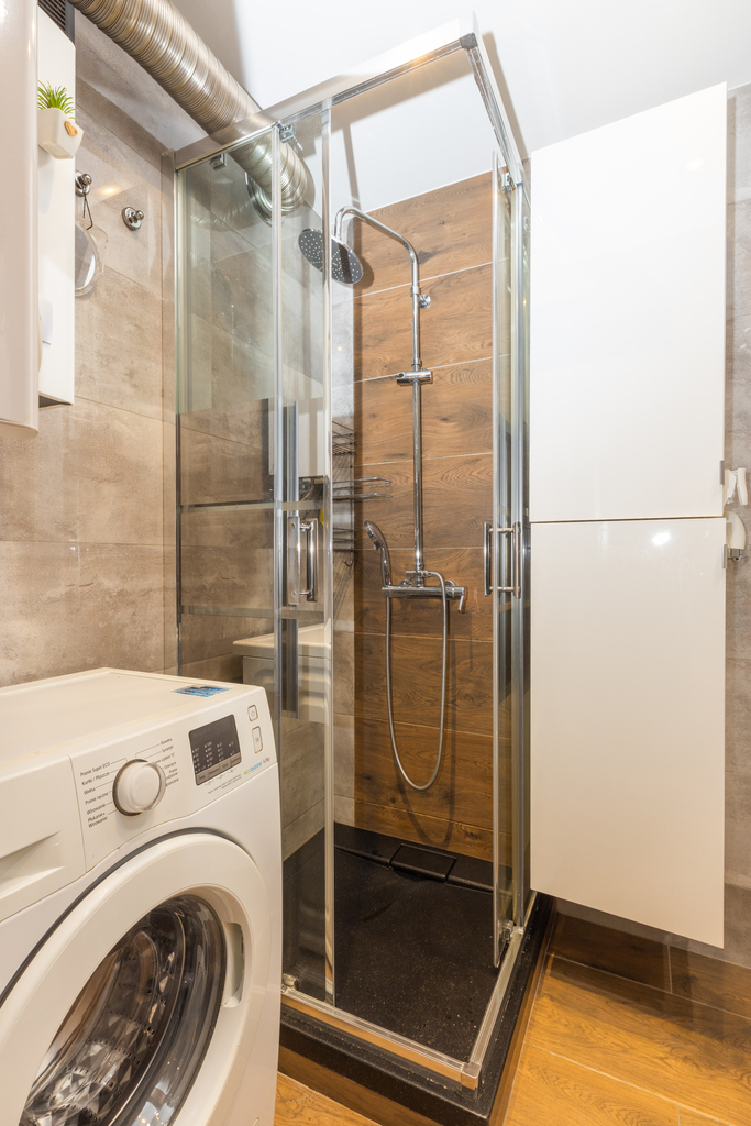 Łazienki: kabina z odpływem linowym, szafka z umywalką, bateria, szafka wisząca,
