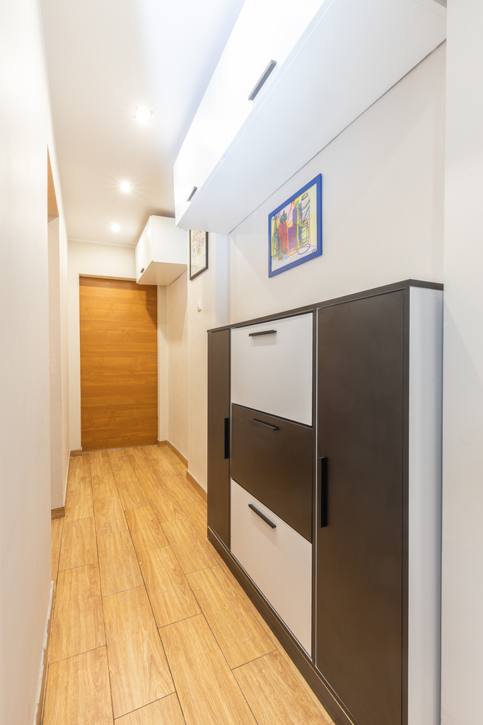 przedpokój: szafa w zabudowie, siedzisko do ubierania butów, szafka stojąca, szafka na buty