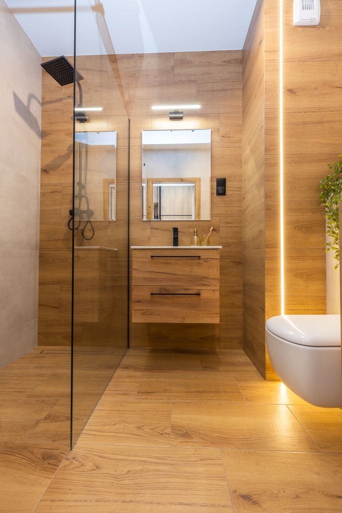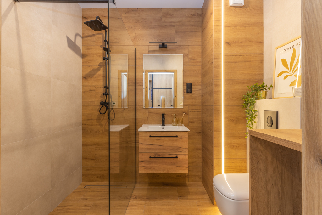 – wykończenie łazienki (położenie płytek, montaż nowego wyposażenia: prysznica z odpływem liniowym, WC podtynkowego, umywalka z szafką, szafek wiszących, kinkiet