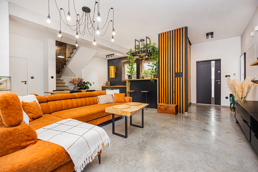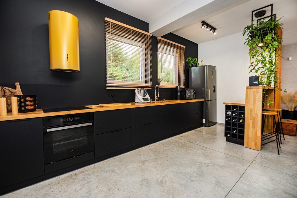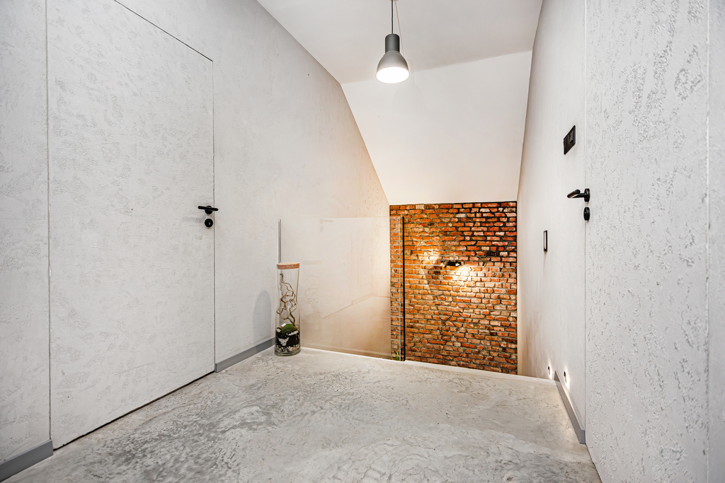Na podłogach w całym domu beton zacierany, na ścianach gładzie, płytki, beton strukturalny, cegła, lamele, parapety drewniane, drzwi wewnętrzne bezprzylgowe pokryte betonem ( na poddaszu ), klimatyzacja w sypialni oraz pokoju dziecięcym, na oknie tarasowym zainstalowana moskitiera