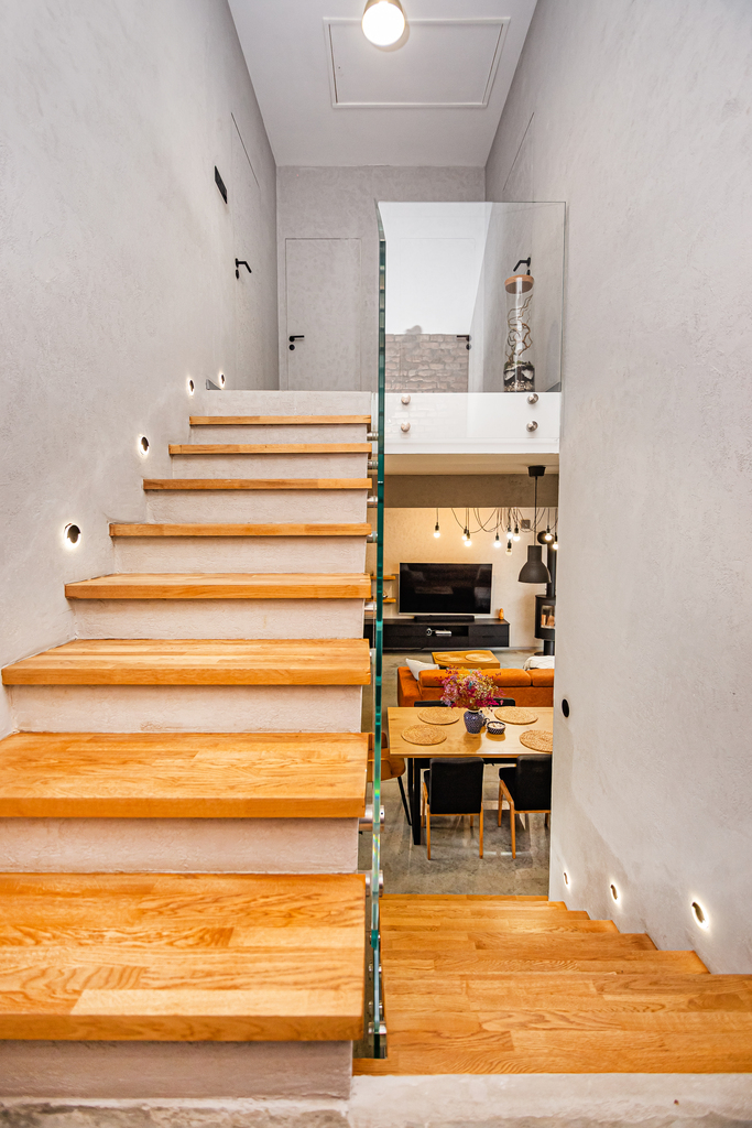 Schody wewnętrzne : żelbetowe, monolityczne o grubości płyty 12 cm,  wykończone drewnem dębowym, podświetlane