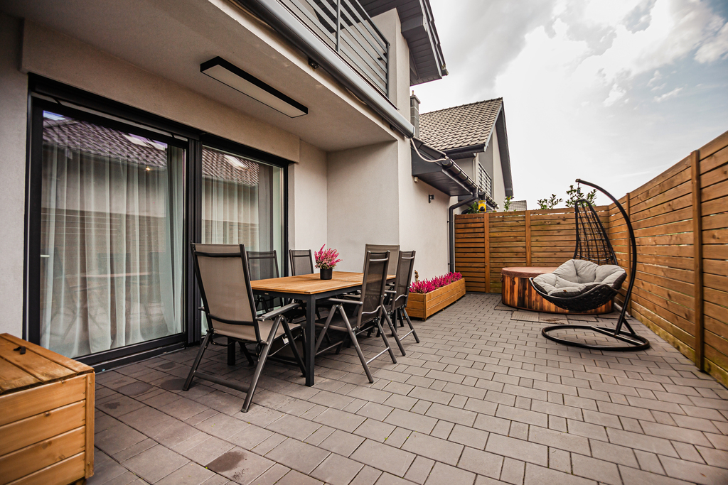 Rolety zewnętrzne na parterze, dodatkowo markiza elektryczna