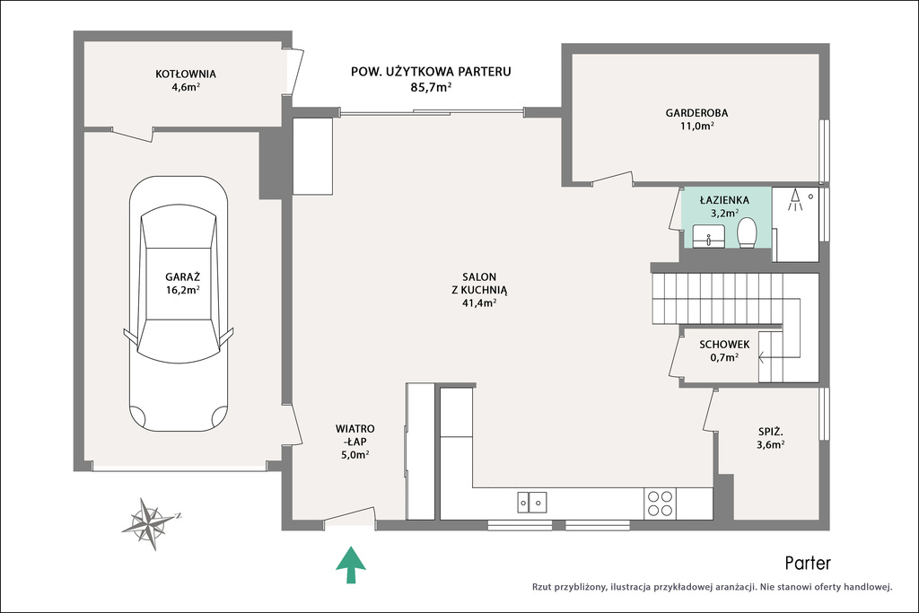 Garaż: tak (16,2m2) jednostanowiskowy w bryle budynku, brama garażowa Wiśniowski