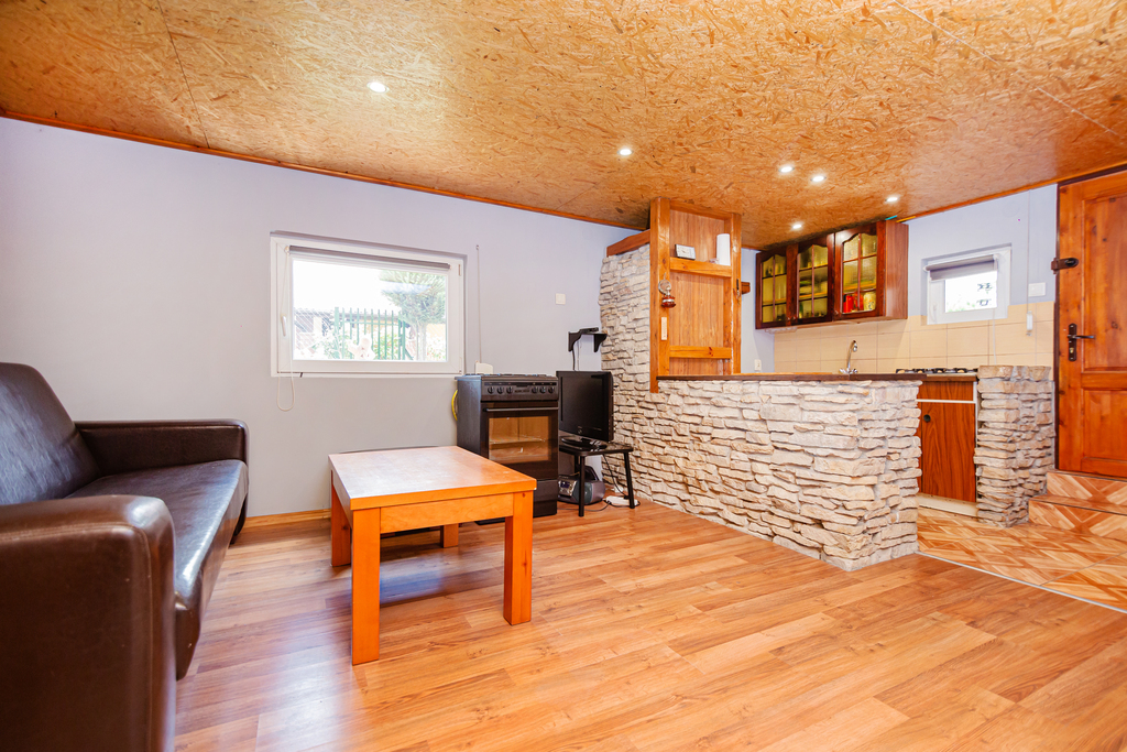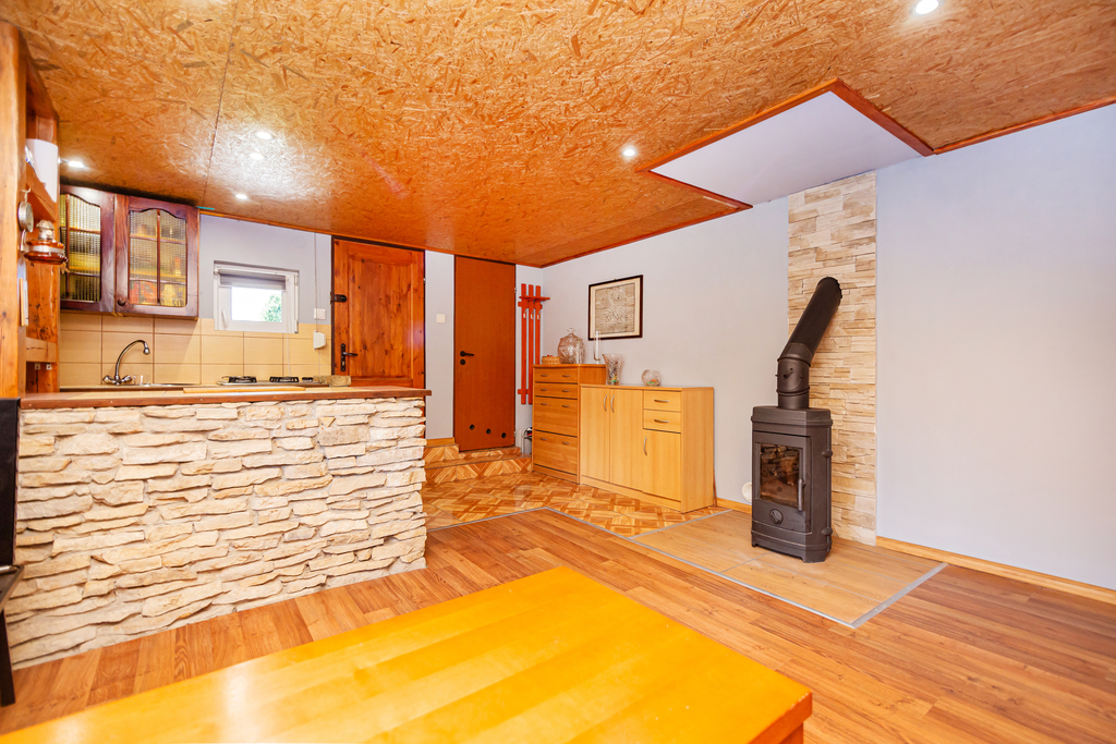 Domek w dobrym stanie technicznym, na podłodze panele oraz płytki, na ścianach kamień ozdobny oraz płyty, okna PCV oraz rolety manualne.