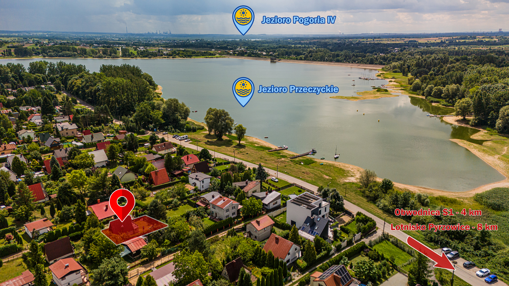 BARDZO DOBRA LOKALIZACJA, Nieruchomość położona przy spokojnej ulicy Nadbrzeżnej, zaledwie 100 m od Jeziora Przeczyckiego. Okolica cicha i zielona, idealna na wypoczynek.W pobliżu droga S1 (~4,7 km) i DK78, zapewniające szybki dojazd do Katowic (~26 km), Dąbrowy Górniczej i Siewierza.