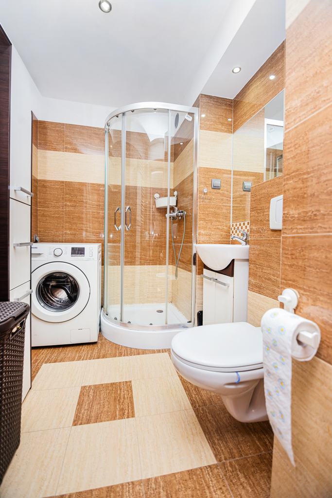 Łazienki: WC podtynkowe, kabina prysznicowa, umywalka z szafką, lustro