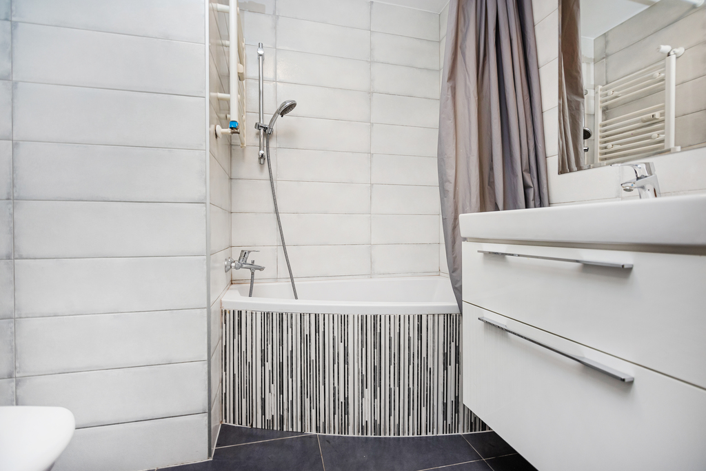 Łazienki: wanna, WC, umywalka z szafką, lustro