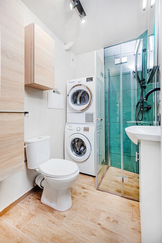 Meble łazienkowe, prysznic, umywalka i WC