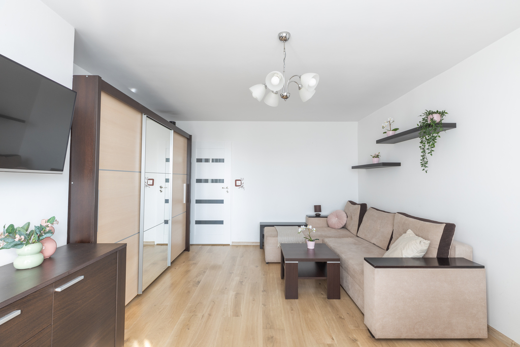 Centralnym punktem mieszkania jest duży jasny salon z balkonem, z którego rozpościera się