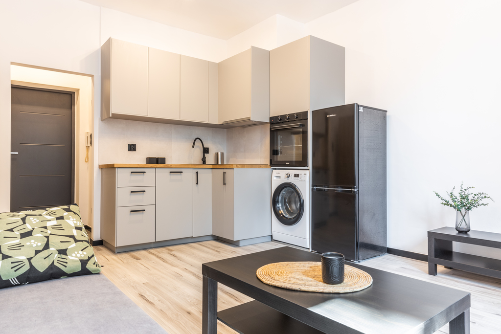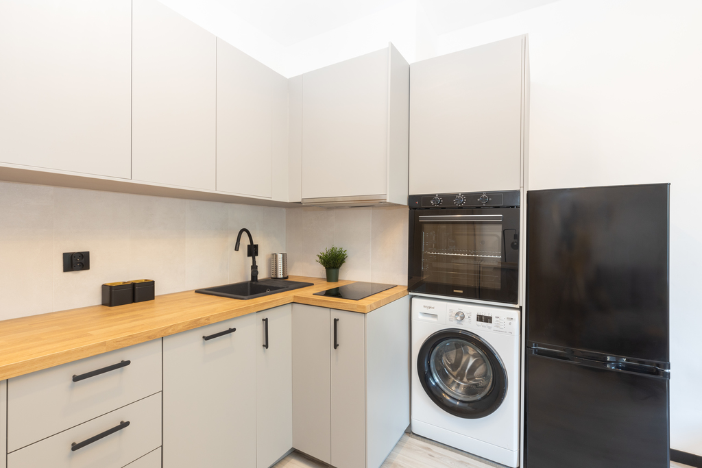 Aneks kuchenny – meble, płyta indukcyjna, lodówka, piekarnik, okap, zmywarka, pralka