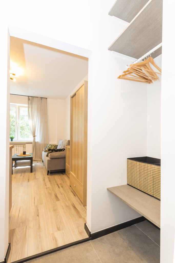 Metraż został w pełni wykorzystany zachowując wygodę i przestrzeń. Pokój posiada strefę wypoczynku i duży aneks kuchenny. Łazienka została wyposażona w kabinę prysznicową.