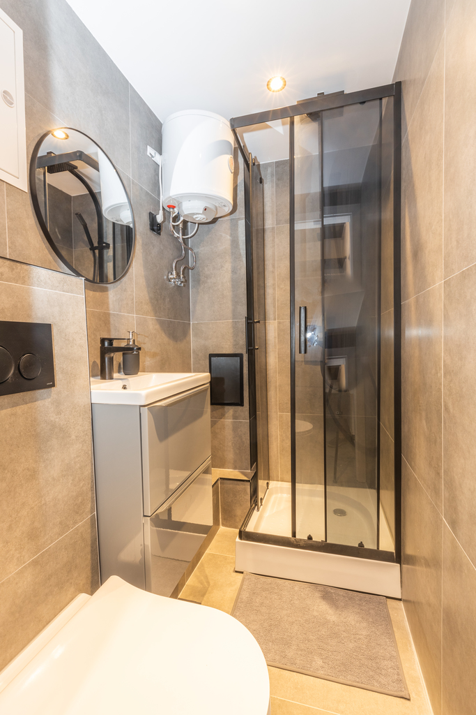 Łazienki – kabina prysznicowa, WC, szafka z umywalką
