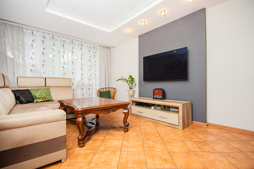 Mieszkanie jest zadbane. Ostatnie odświeżenie obejmujące malowanie miało miejsce w 2023r. Na podłogach są położone płytki, na ścianach zrobione są gładzie, tynk strukturalny oraz kamień. W 2023r zostały również wymienione drzwi wejściowe na atywłamaniowe oraz drzwi wewnętrzne. Instalacja wod-kan pcv, parapety drewniane oraz plastikowe, obniżone zostały również sufity w salonie i sypialni.