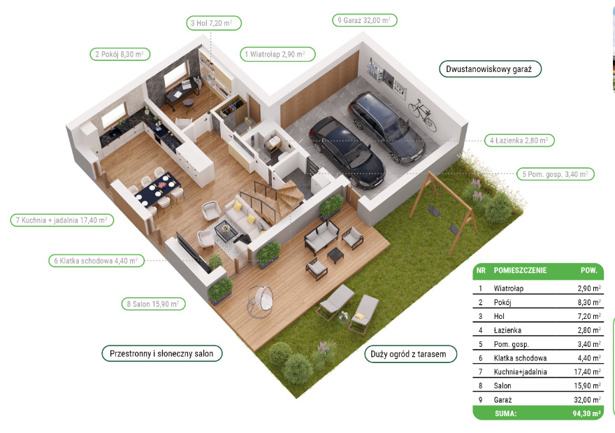 Garaż: tak, dwustanowiskowy w bryle budynku (pow. 32 m2)