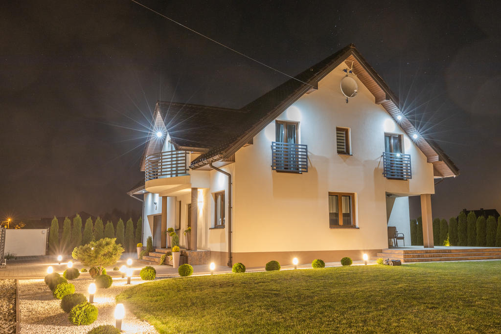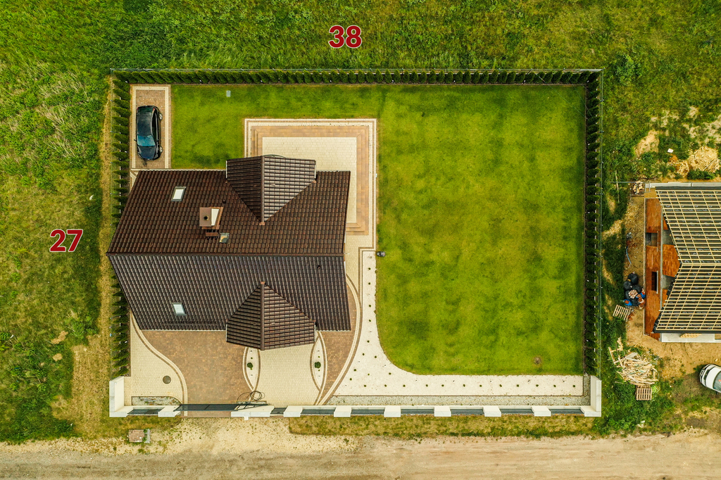 Cały teren został wyrównany, podjazd wybrukowany kostką. Pozostała, zielona część została otoczona 2 m tujami i wyposażona w nowoczesny system nawadniania z podlewaniem kropelkowym.