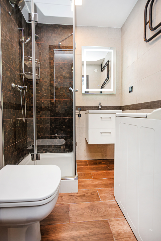 – łazienki – umywalka, szafka, WC, kabina prysznicowa, pralka, piecyk gazowy
