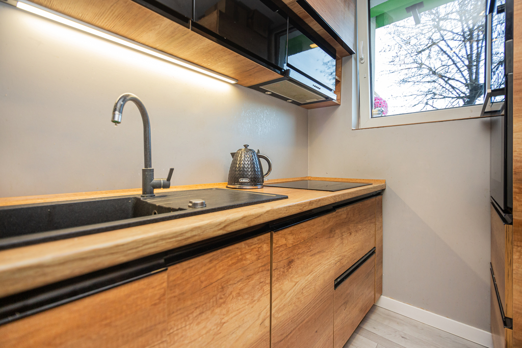 – kuchni (meble w zabudowie zrobione na wymiar, zlew, piekarnik, płyta indukcyjna, okap, mikrofalówka, lodówka)
