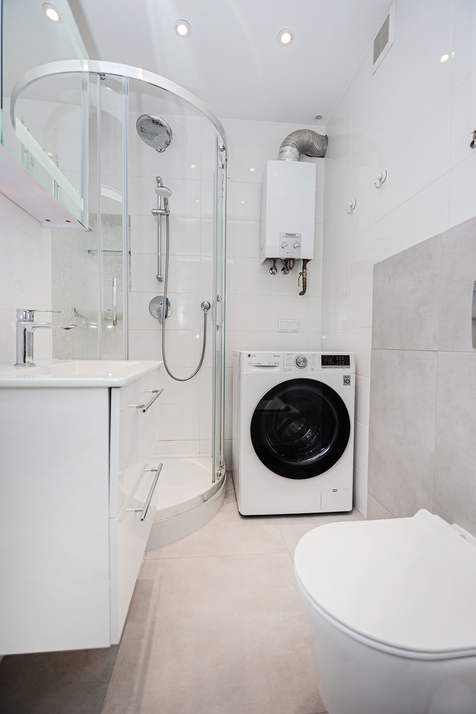– łazienki i WC – umywalka, szafka, WC, kabina prysznicowa, pralka, piecyk gazowy
