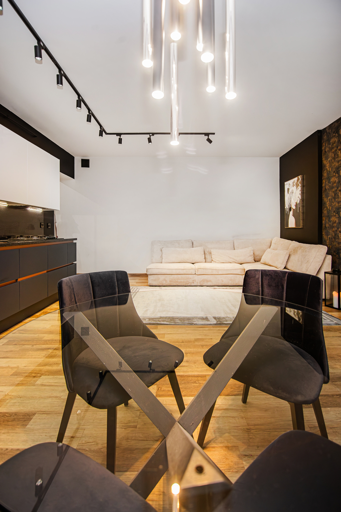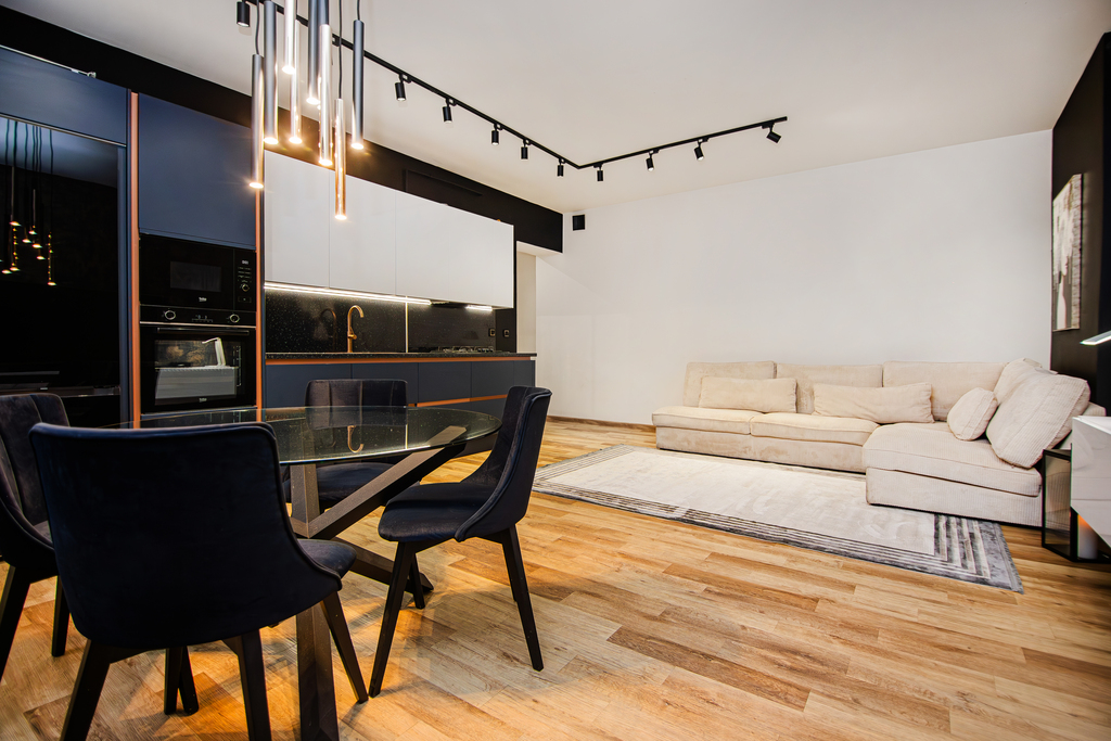 – salon – kanapa narożna, szafka pod telewizor, stół i krzesła, klimatyzacja