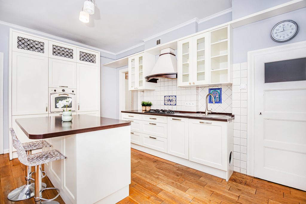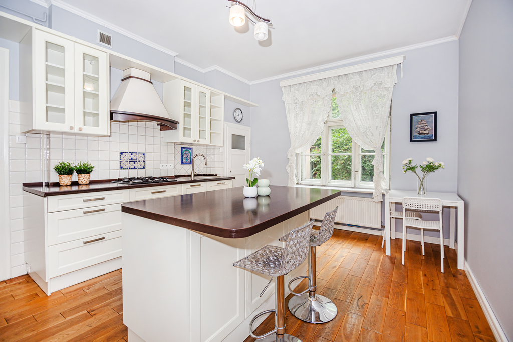 Kuchnia: meble w zabudowie, płyta grzewcza gazowa, okap, zmywarka, piekarnik elektryczny, lodówka, stół z 2 krzesłami, wyspa,