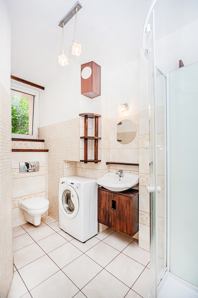 Łazienka: umywalka, szafka, kabina prysznicowa, WC