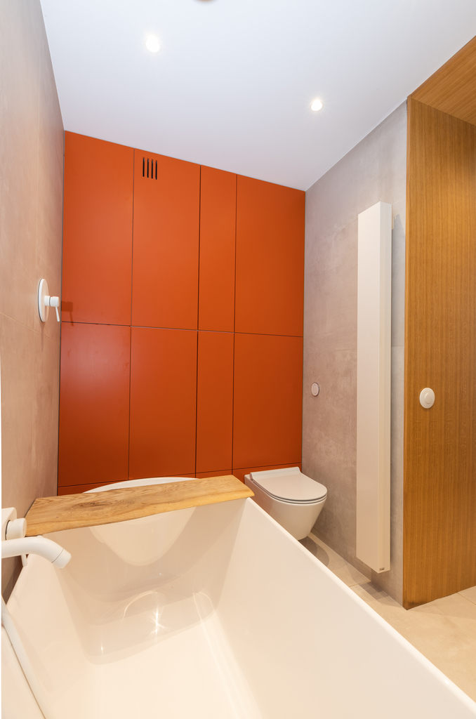 Łazienki – wanna wolnostojąca Marmorin, Baterie wiszące Gesse, umywalka wolnostojąca typu monument, zabudowa z lakieru UV, pralka