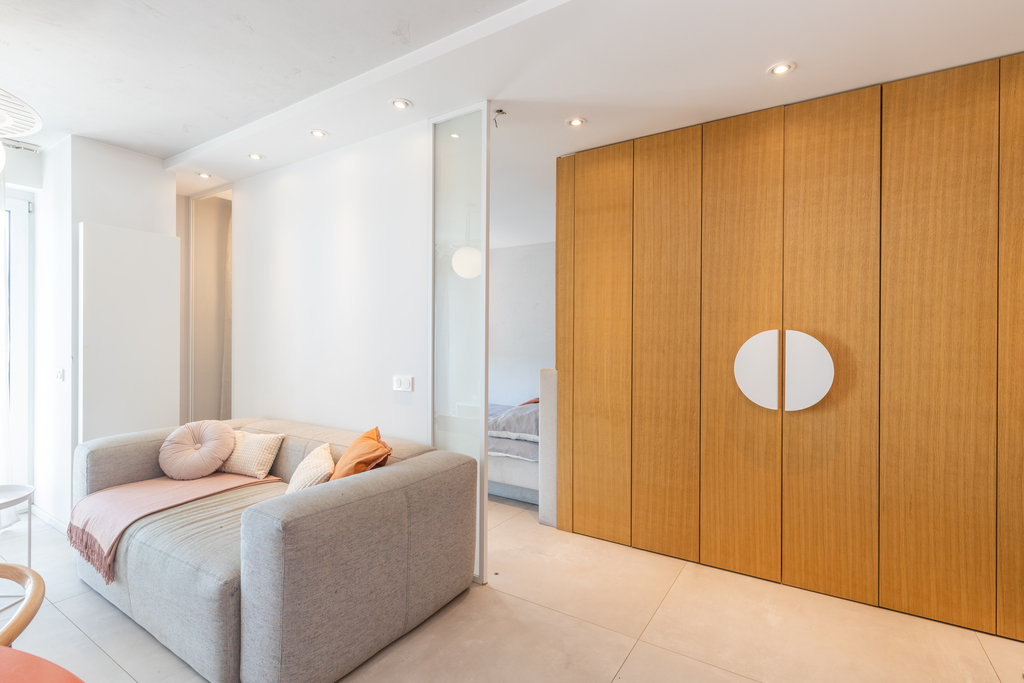 Mieszkanie zostało wykończone w 2022 r. Projekt realizowany przez firmę architektoniczną, która zadbała o funkcjonalność i jakość wykonania. Zmieniony został układ pomieszczeń i dodano w ścianach przeszklenia, które dodatkowo otwierają przestrzeń. W mieszkaniu na ścianach są gładzie i tynk strukturalny, sufity podwieszone. Podłogi i łazienka wykończona płytkami włoskimi – Atlas Concorde. Zabudowa meblowa na wymiar z forniru. Wnętrza dopełnia designerskie oświetlenie na zamówienie firmy Vibia.